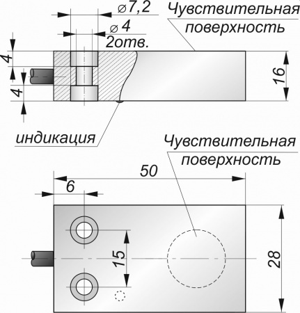 Датчик имеет чувствительную поверхность, предназначенную для контроля наличия металлических объектов. Попадание металлического обьекта в зону чувствительной поверхности вызывает изменение коммутационного состояния датчика.