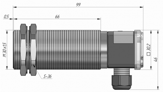 Индуктивный датчик ВБИ-М30-76К-1113-С в цилиндрическом корпусе из никелированной латуни Ø30 мм, в общепромышленном исполнении.