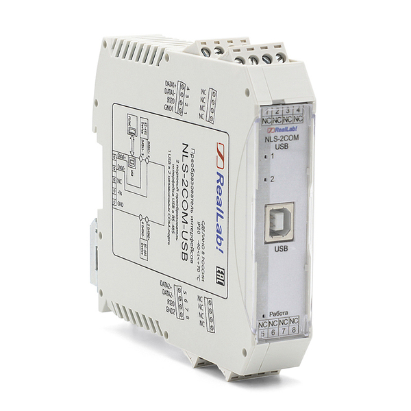 Преобразователь - разветвитель интерфейса NLS-2COM-USB предназначен для преобразования интерфейса USB в 2 порта RS-485 (2 независимых виртуальных COM порта). Модуль ретранслирует передаваемые по сети запросы от ведущего (master), подключенного к интерфейсу USB, к ведомым (slave), подключенным к каналам Data1…Data2 (RS-485). При этом ответы ведомых, с любого из 2 каналов, передаются только в USB интерфейс – ведущему, и не дублируются в соседние каналы.