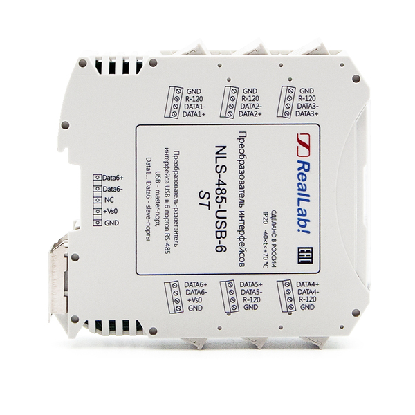 Преобразователь-разветвитель интерфейсов NLS-485-USB-6-ST позволяет соединять устройства с портами USB и RS-485. Ретранслирует передаваемые запросы от ведущего (master), подключенного к порту USB, к ведомым (slave), подключенным к портам RS-485 (Data1...Data6); формат передаваемых данных не имеет значения. При этом ответы ведомых, с любого из 6 каналов, передаются только в порт USB - ведущему, и не дублируются в соседние каналы.