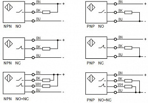 Питание 12-24 DC, подключение осуществляется через кабель 2 м. Сигнал на выходе — типа PNP, срабатывает NO+NC.