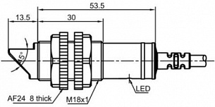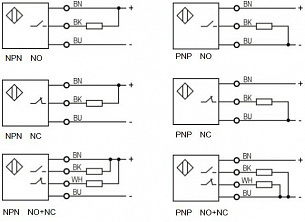Питание 12-24 DC. Подключение осуществляется через кабель 2 м. Сигнал на выходе — типа npn, срабатывает no+nc.