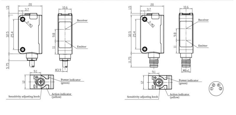 Применяется как датчик диффузного отражения, работает при напряжении в пределах 12-24 DC. Соединение осуществляется через кабель длиной 2 м. Выход — NPN со срабатыванием на свет/на затемнение. Устройство излучает красный. Особенность модели — универсальный корпус, подходит для суровых условий эксплуатации, удобная и быстрая настройка.