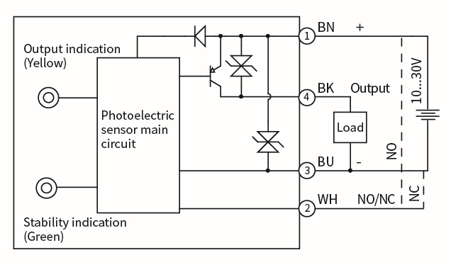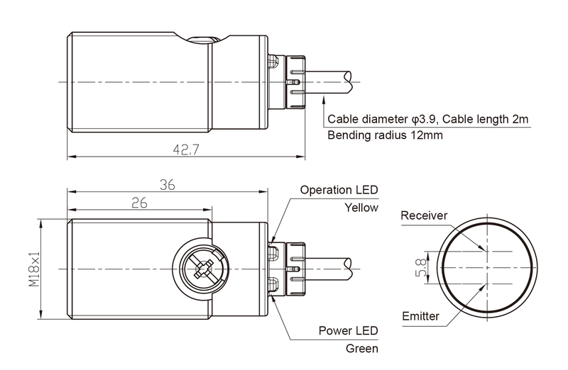 Применяется как датчик диффузного отражения. Работает при напряжении в пределах 12-24 DC. Соединение осуществляется через кабель 2 м. Выход — pnp со срабатыванием на свет/на затемнение. Устройство излучает инфракрасный. Важная особенность модели — компактный корпус, подходит для суровых условий эксплуатации, обнаружение объектов на ярком фоне.
