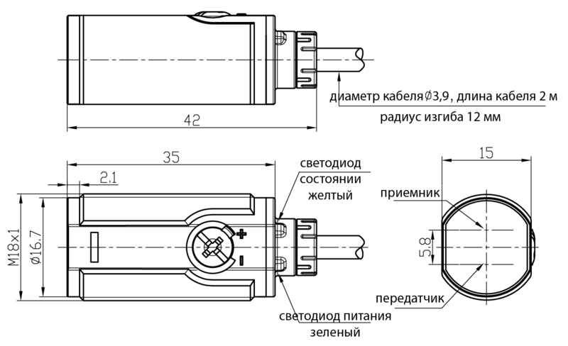 Применяется как датчик диффузного отражения. Работает при напряжении в пределах 12-24 DC. Соединение осуществляется через кабель 2 м. Выход — npn со срабатыванием на свет/на затемнение. Устройство излучает инфракрасный. Важная особенность модели — компактный корпус, подходит для суровых условий эксплуатации.