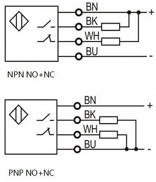 Питание 12-24 DC. Подключение осуществляется через кабель 2 м. Сигнал на выходе — типа npn, срабатывает no+nc.